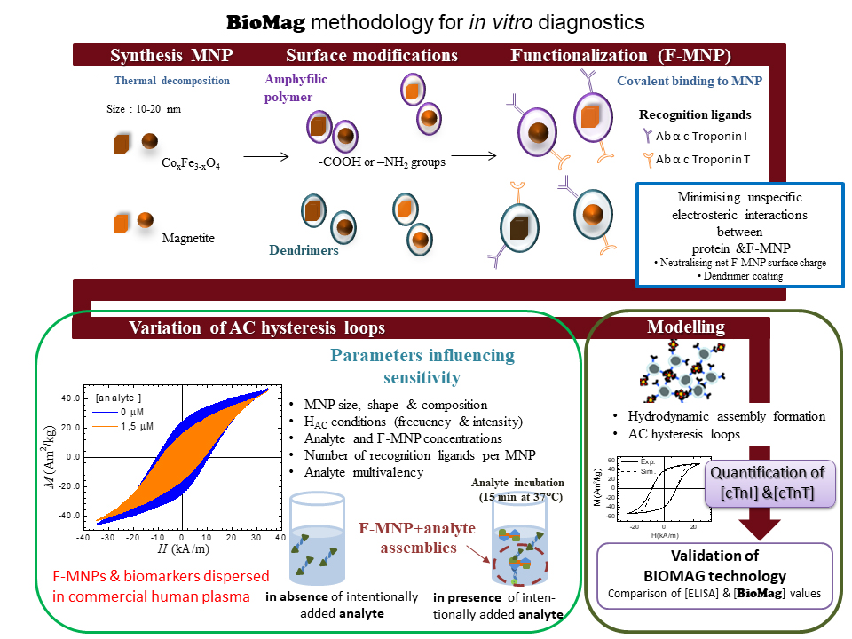 An ever-increasing number of medical applications are adopting nanotechnology to a variable extent in order to go beyond the current state-of-the-art. Targeted drug delivery, regenerative medicine, tissue engineering, or biosensing already benefit from using nanomaterials to improve the current healthcare systems of our society. BioMag aims to provide a quick, sensitive, precise, reliable and low-cost in vitro diagnostics methodology for detection of biomarkers taking advantage of the current progress on the synthesis and characterisation of magnetic nanoparticles for developing and validating a novel magnetic detection of biomarkers present in human blood plasma. The BioMag detection methodology is grounded on: i) the design of magnetic nanoparticles functionalised with recognition ligands (F-MNPs) that specifically interact with cardiac biomarkers (I and T troponins) related to myocardial infarction, ii) the change of magnetic properties of F-MNPs upon interaction with biomarkers (i.e. analyte), iii) the use of such variation of the magnetic properties of F-MNPs reflected on the hysteresis loops to quantify the target biomarkers. BioMag aims to bring the proposed technology from its initial Technology Readiness Level (TRL) 2 to 5. Indeed, recent results from IMDEA team showed the proof of concept of this novel and original methodology, which enables a significant modulation of the detection sensitivity by distinct means (i.e. MNP chemical composition and size, field conditions, multivalency of analyte, number of ligands per MNP). The advantage of the BioMag method with respect to other magnetic-ones is the quasi-instant measurement time (a few seconds), the non-required sample preparation prior the dispersion of F-MNPs in the sample, and the low cost of the required instrumentation (i.e. AC magnetometer).